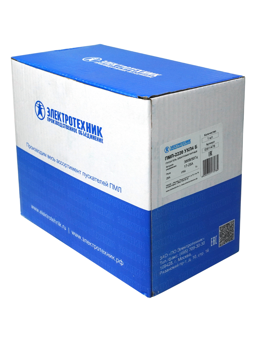 ПМЛ-2220 УХЛ4 Б, 380В/50Гц, 1з, 25А, нереверсивный, с реле РТЛ-1022-2 17-25А, в корпусе из пластика IP54, с кнопками ПУСК + СТОП, пускатель электромагнитный (ЭТ)